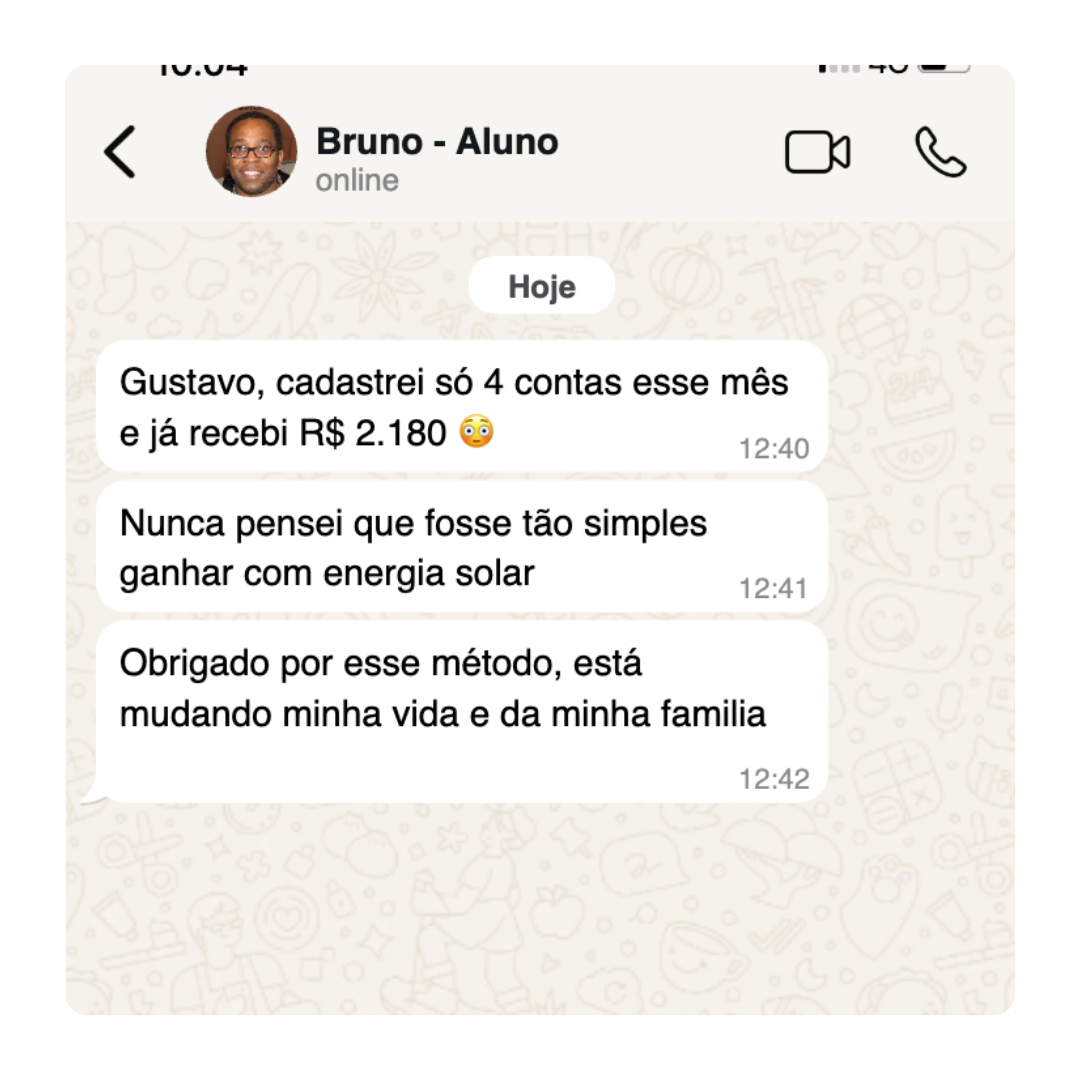 Com uma abordagem simples, prática e 100% online, ele ensina como qualquer pessoa pode gerar comissões recorrentes apenas conectando consumidores a usinas solares. Sem vender placas, sem precisar entender de energia, e sem sair de casa.